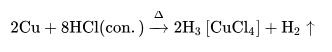 銅在無空氣時(shí)難溶于稀鹽酸,但其能溶于熱濃鹽酸中,放出氫氣: