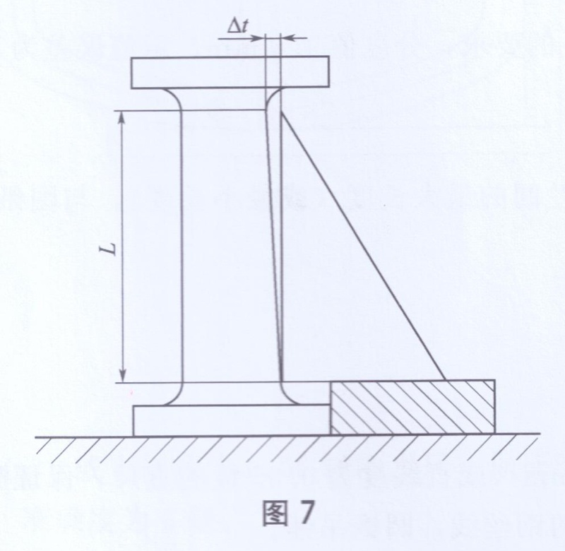 將被測塔節(jié)法蘭端放置在平臺(tái)上,在緊靠法蘭邊處墊放一平行度標(biāo)準(zhǔn)圓墊塊,用直角尺貼靠在塔節(jié)壁上(如圖7所示),繞塔節(jié)軸線旋轉(zhuǎn)平行度標(biāo)準(zhǔn)圓墊塊和直角尺,用直尺景取旋轉(zhuǎn)一周中塔節(jié)做體外壁與直角邊的最大距離△t,此值即為塔節(jié)法蘭對塔節(jié)的垂直度。