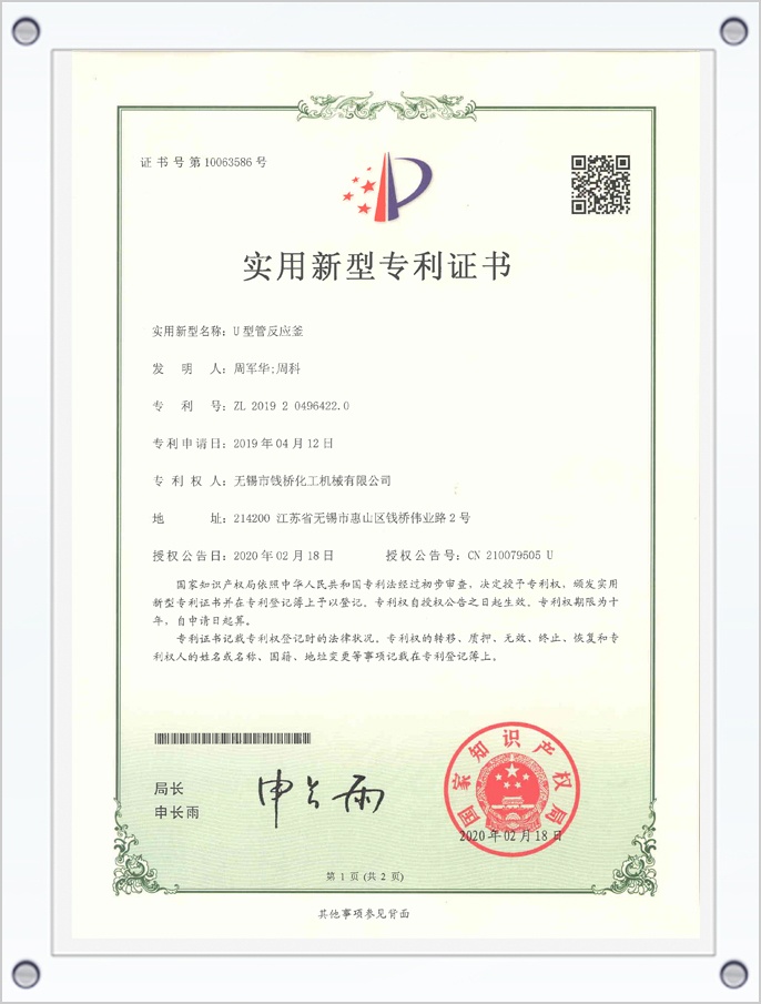 U型管反應(yīng)釜專利證書