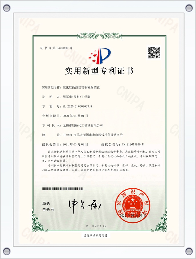 碳化硅換熱器管板密封裝置專利證書
