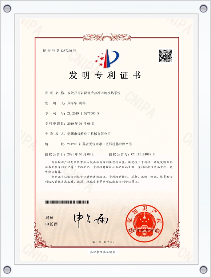 搪瓷管板型碳化硅化熱器專利證書