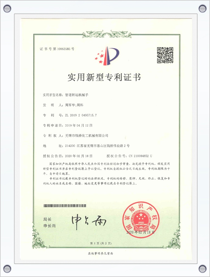 管道轉(zhuǎn)運(yùn)機(jī)械手專利證書