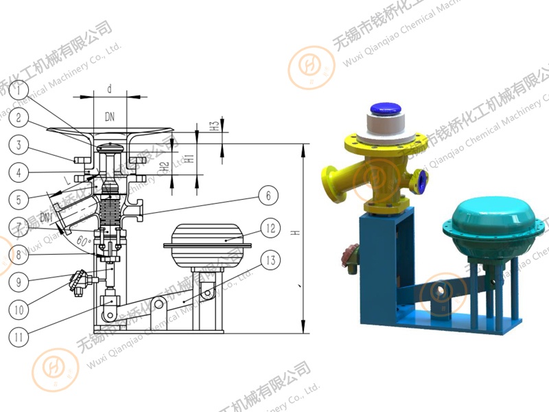 搪玻璃上展式自動放料閥(側(cè)向執(zhí)行機構(gòu)) *內(nèi)置測溫氣動放料閥