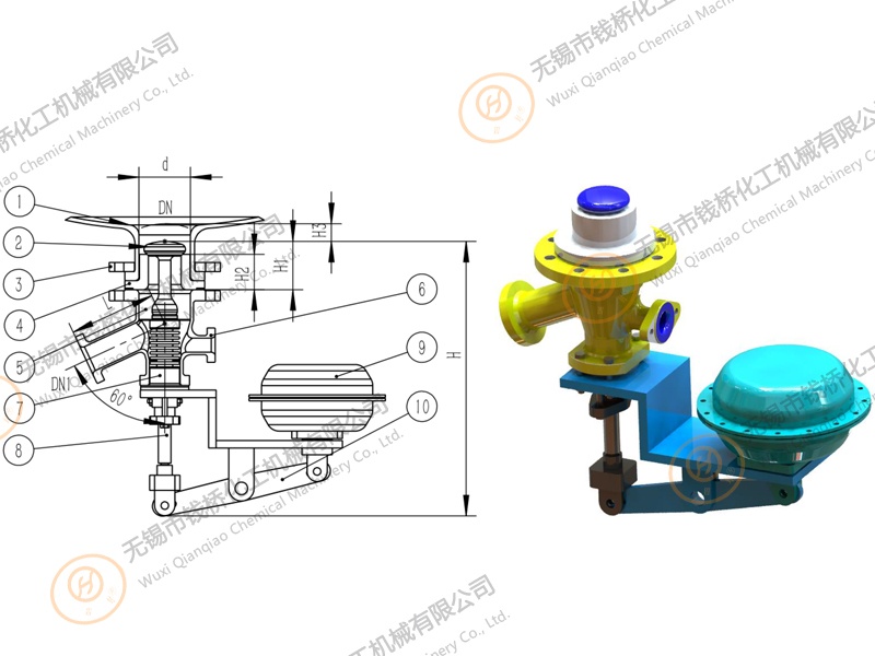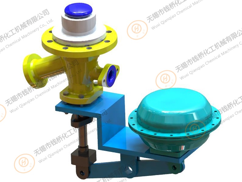 Bottom outlet valve (60°) gap free with pneumatic actuator(Side cylinder)搪玻璃上展式自動(dòng)放料閥(側(cè)向執(zhí)行機(jī)構(gòu)).The inorganic acid, organic acid, weak alkali solution and organic solvent are superior to stainless steel in strong corrosive media such as hydrochloric acid, ni